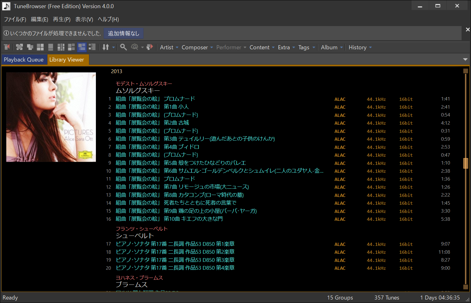 筆者の場合は、手持ちアルバム数が多すぎるため、アルバムすべてをTuneBrowserに登録すると使い勝手が落ちると思っています。そのため、自分が再生するアルバムだけを登録する方法を採っています。このような使い方をしている人にとっては、楽曲管理数は困る要素になりません。