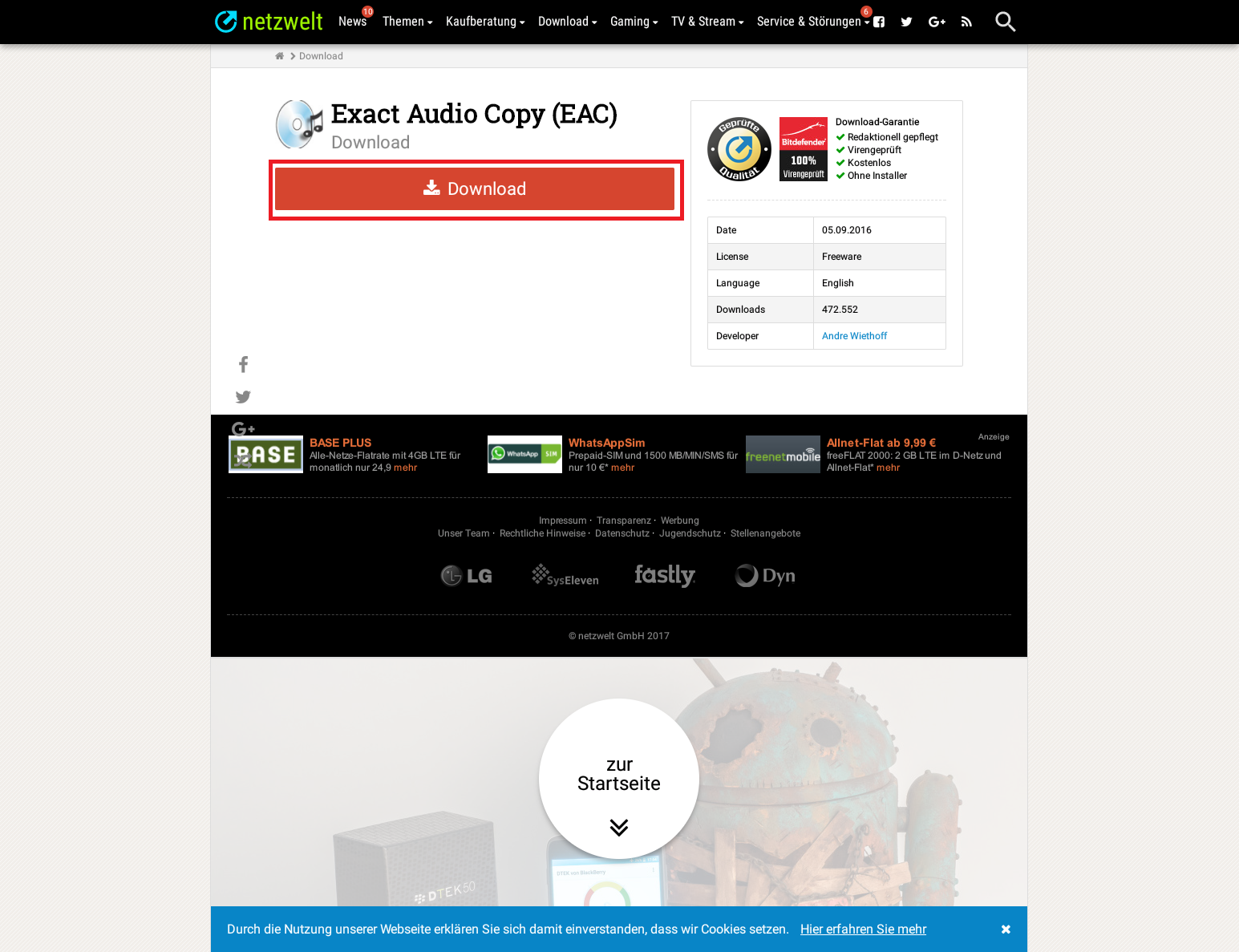EACの公式ページ「EXACT AUDIO COPY」にアクセスし、メニュー左の「Download」をクリックします。